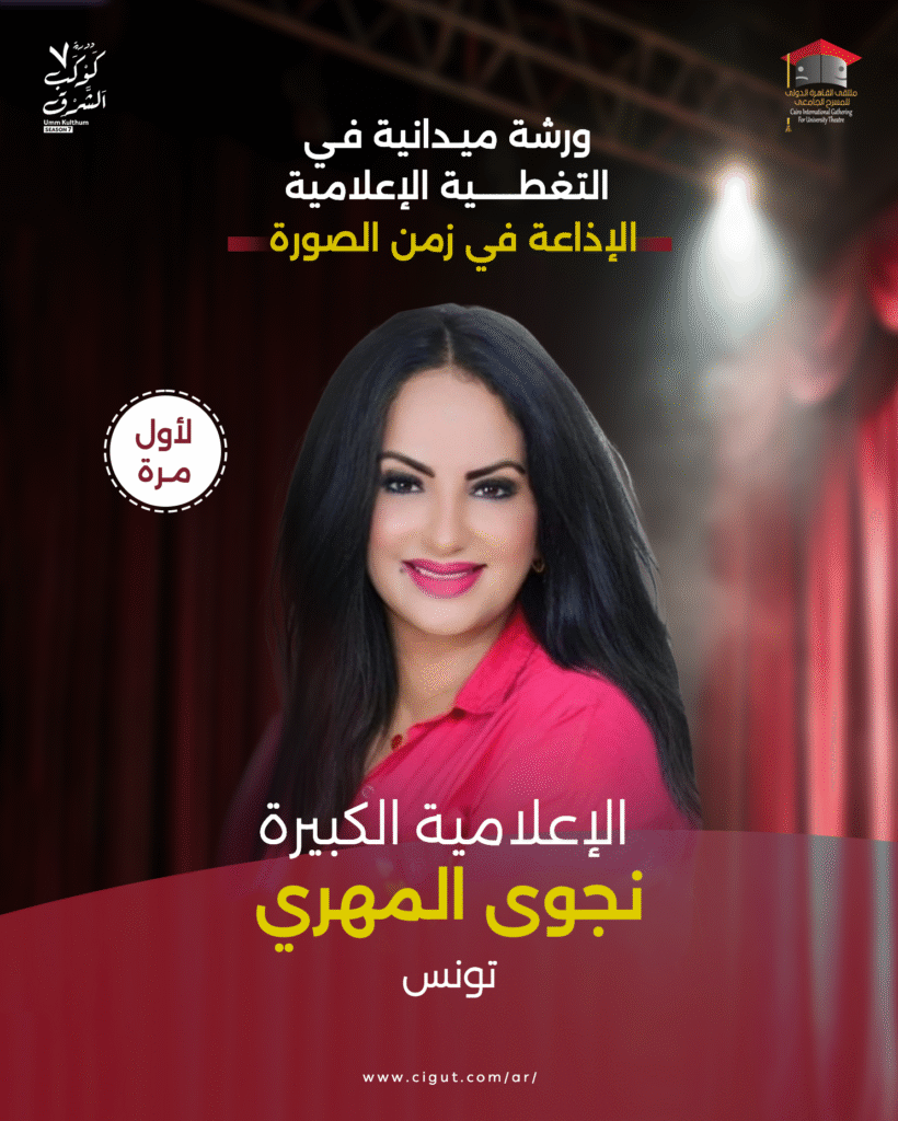 - ضرورة ارسال ما يفيد بدفع قيمة الورشة مع صورة شخصية واضحة وصورة من بطاقة الرقم القومي على الواتس آب الخاص بالرقم . لضمان تأكيد حجز الاشتراك في الورشة.نجوى المهري صحفية ومنتجة ومقدمة برامج إذاعية بإذاعة المنستير التابعة لمؤسسة الإذاعة التونسية.